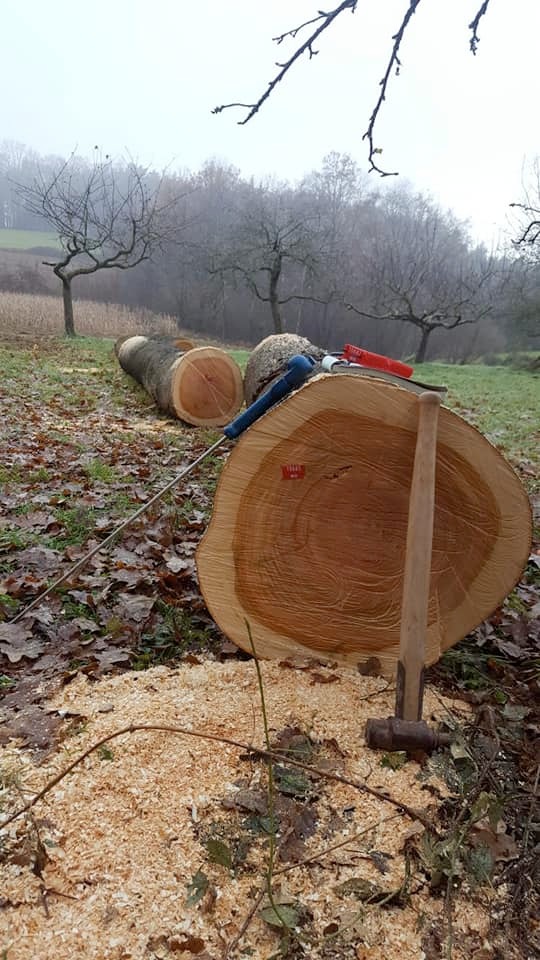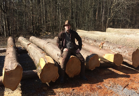 Ukázka aukce cenných sortimentů, kde jsou prodávány hodnotné kmeny nejen ovocných dřevin, jako je např. třešeň ptačí. Na ní právě autor článku pózuje před fotografem (Německo).