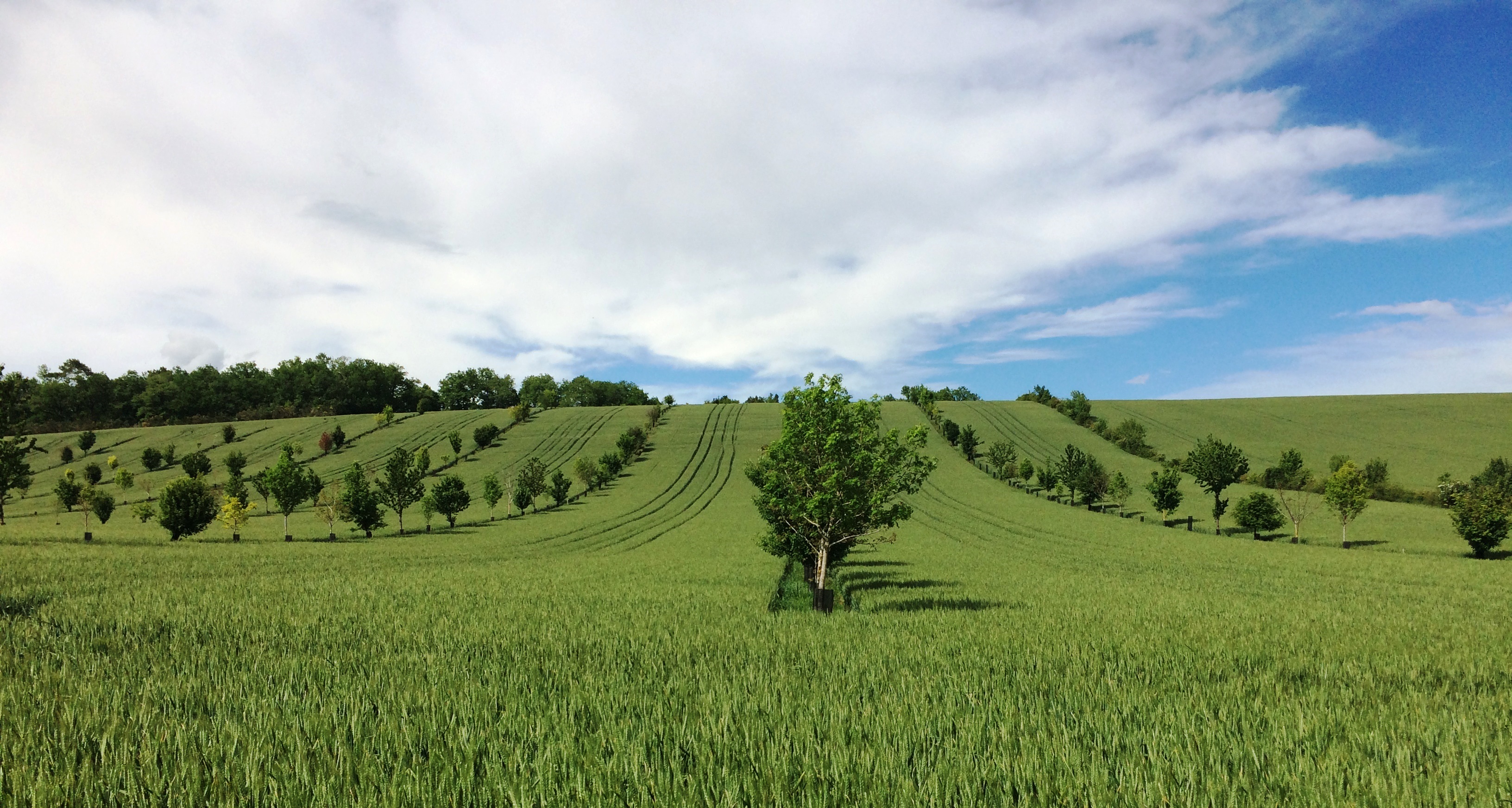 Pohled na agrolesnický systém ve Francii, jehož cílem je kombinovat rostlinou produkci s pěstováním cenného dříví ovocných dřevin.